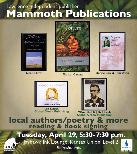 oin Mammoth Authors and Publishers for a celebration of 10 years in business with a reading featuring XánathCaraza and Global Green partners Julie Unruh and Oliver Hall. Stephen Meats and local Mammoth authors will be introduced and read briefly. Denise Low and Tom Weso, co-publishers of Mammoth and KU graduates, will also read from Mammoth books. Refreshments will complete this end-of-the-work-day event.