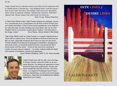 Fate Lines/ Desire Lines, by Caleb Puckett, is a superb collection from a poet with an original voice and a daring approach to language. He speaks to all kinds of lines that define our lives, especially storylines about what our lives are and are not. Puckett inhabits the landscape of possibilities, designing his own poetic forms, re-inventing traditional forms, and giving new life to prose poems and free verse. Puckett prompts us to think through those lines we carry and carve across the earth. Fate Lines/ Desire Lines balances between choice and compulsion, nature and persuasion.